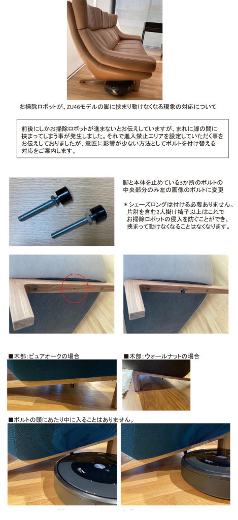 投稿日: 2025年11月25日2025年11月25日 投稿者: カリモクゴールドマイスターエキスパートソファ46モデル用お掃除ロボット対応ボルト 46モデルのソファの脚に、お掃除ロボットが挟まってしまうという事がありました。そこでその対応ができるボルトが発売になっています。価格は¥3,300(税込)です。